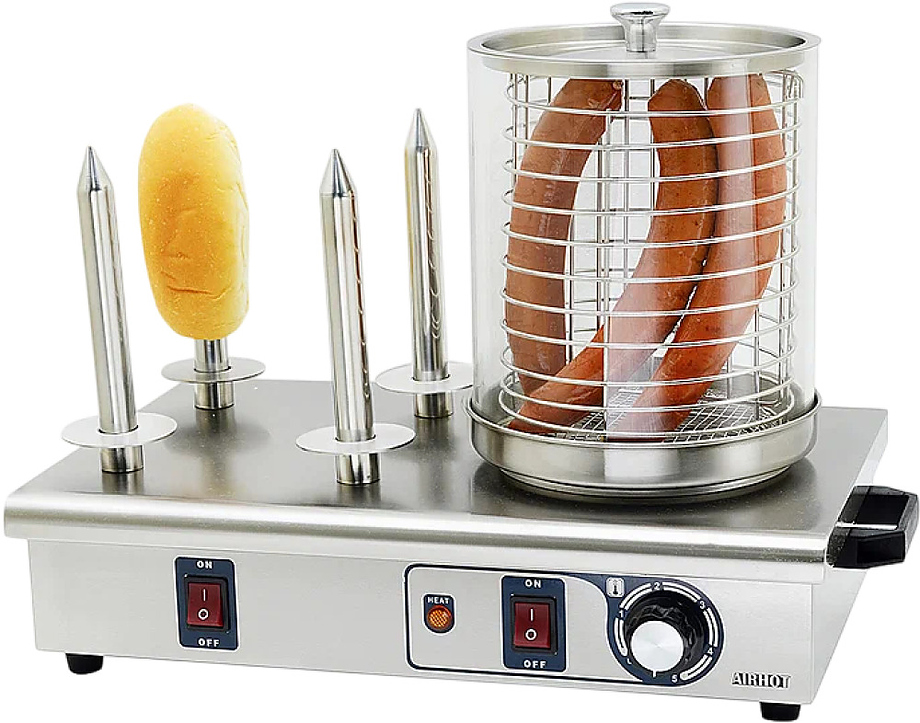 Аппарат для приготовления хот-догов Airhot HDS-04 представляет собой идеальное решение для гастрономических заведений и уличной торговли. Он оборудован стеклянной емкостью для варки сосисок и четырьмя штырями, предназначенными для подогрева булочек, что делает его незаменимым помощником в быстром обслуживании клиентов.