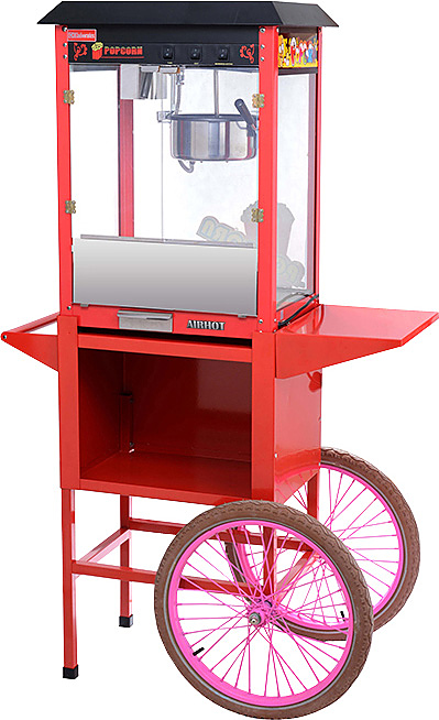 Эта модель, оснащенная мобильной тележкой, позволяет легко перемещать аппарат и продавать попкорн в самых разных местах, включая парки, скверы, уличные мероприятия и летние кафе.