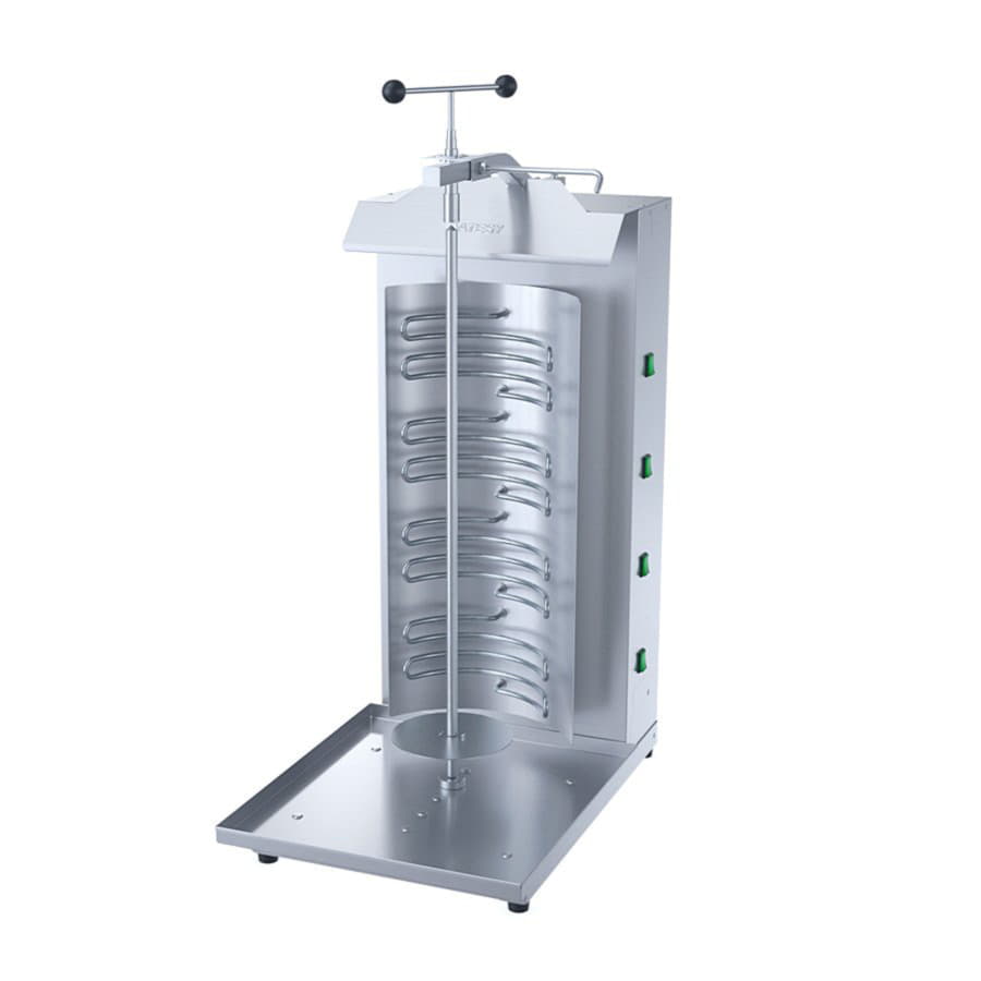 Равномерное приготовление продукта обеспечивается за счет: специальной изогнутой формы ТЭНов; оптимальной скорости вращения ножа; наличия отражателей тепла. Отдельное включение нагрева каждого ТЭНа. Регулировка расстояния между ножом и горелками позволяет подобрать оптимальный режим приготовления продукта. Защитный козырек препятствует перегреву электропривода, увеличивая срок его службы. Усилена нижняя шайба и штанга крепления ножа. В стандартной поставке установка Шаурма оснащена ручным приводом ножа.