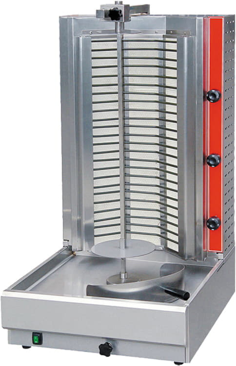 Электрический гриль VIATTO HES-E2 предназначен для приготовления шаурмы, кебабов, жарки мяса и курицы. Вертикальный шампур вращается вокруг своей оси около электрических ТЭНов, благодаря чему продукты обжариваются равномерно. Оснащён 3 зонами нагрева, каждая из которых устанавливается отдельным терморегулятором.