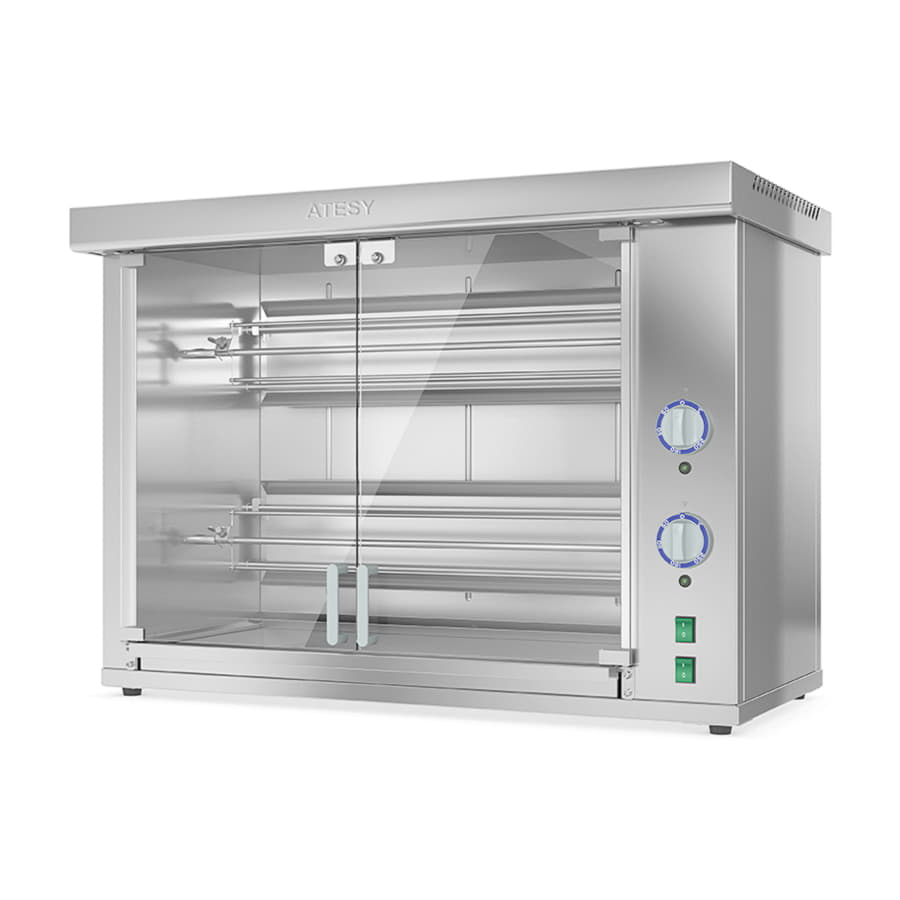 Постоянная скорость вращения шампура и оптимальное расстояние от тушки до ТЭНов обеспечивают равномерную прожарку кур и высокую производительность гриля. Специальный узел вращения и поддержки шампура обеспечивает быструю установку и выемку шампура из гриля. Шампур имеет три спицы и оснащен торцевыми фиксаторами кур, исключающими проворачивание кур во время приготовления. Стеклянные дверцы имеют магнитный фиксатор закрытого положения. В положении открытых дверей шампуры с курами легко вынимаются из гриля. Корпус гриля изготовлен из пищевой нержавеющей стали AISI430.