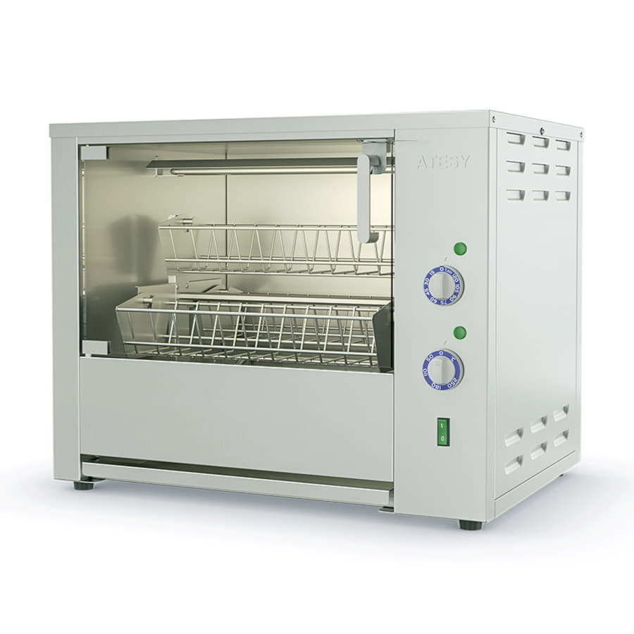В гриле можно готовить как целые тушки кур, так и их отдельные части. Механизм торможения позволяет четко фиксировать положение садков во время остановки вращения. Сочетание скорости вращения и мощности привода обеспечивает качественное приготовление кур при любой (даже несимметричной) загрузке. Двери выполнены из термостойкого ударопрочного стекла. Корпус гриля изготовлен из пищевой нержавеющей стали AISI430.