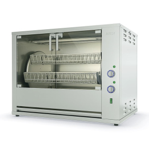 Гриль карусельного типа загрузкой до 18 кур. Куры размещаются внутри гриля на шести легкосъемных садках (люльках), изготовленных из нержавеющего прутка. Садки вращаются вокруг центральной оси внутри рабочей камеры. Механизм торможения позволяет четко фиксировать положение садков во время остановки вращения, исключая проворот при несимметричной загрузке.