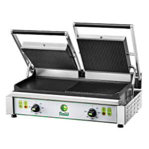 Верхняя рабочая поверхность гриля Fimar PE50ME — рифленная, нижняя — на половину рифленая, на половину гладкая.