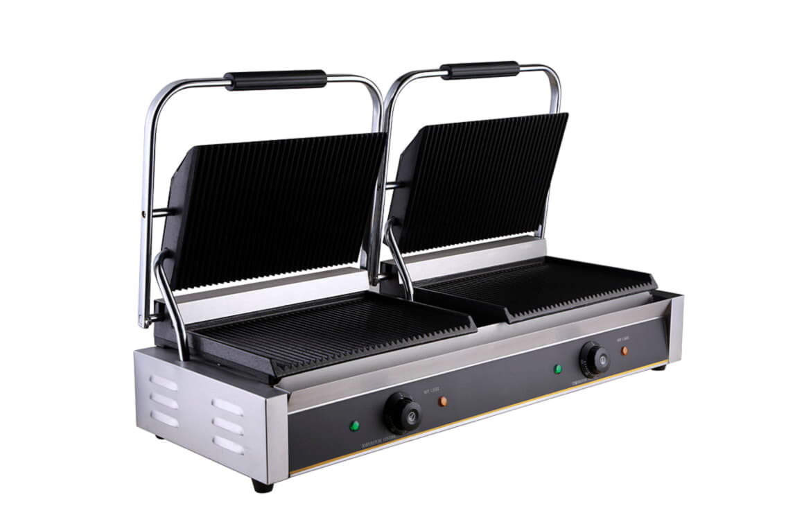 Пресс-гриль электрический, настольный, двойной, большой, 2 рифленые верхние/2 нижние рабочие поверхности размером 350х215х20 мм из чугуна с антипригарным покрытием, рабочая температура 50-300оС, материал корпуса - нерж.сталь