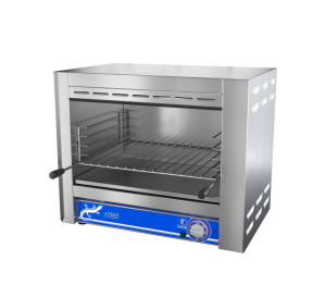 Гриль Саламандра представляет собой шкаф с открытой передней частью, выполненный из нержавеющей стали. Внутри шкафа расположены направляющие для решетки на 4 уровня. Нагрев продукта, расположенного на решетке, происходит посредством ТЭНа, который установлен вверху гриля. Плавная регулировка температуры осуществляется терморегулятором. В нижней части шкафа расположен поддон для сбора остатков пищи.