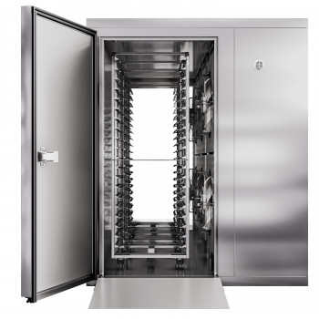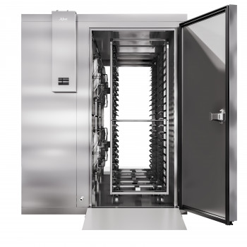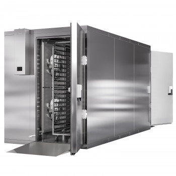 Камера вмещает до 3 тележек, что соответствует 20 х GN 2/1 или EN 2/1. Оборудование оснащено выносным холодильным агрегатом и конденсатором, использующим хладагент R404A.