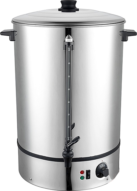 Изготовленный из нержавеющей стали, кипятильник оснащен аварийным термостатом и световыми индикаторами, которые сигнализируют о процессе нагрева и поддержании температуры. Механический регулятор позволяет устанавливать температуру в диапазоне от +30 до +100ºС с шагом в 5ºС.