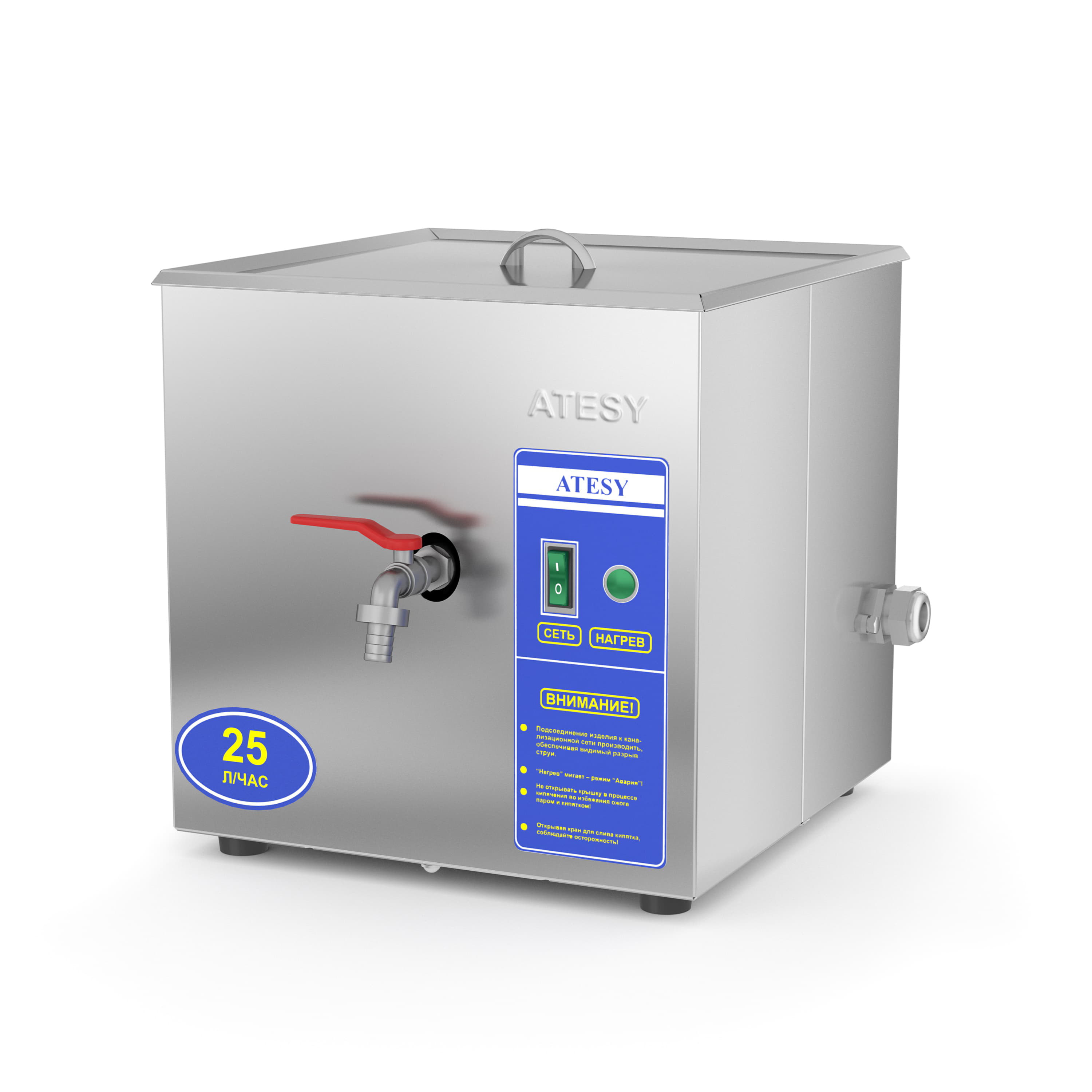 Подготавливает и раздает кипяток гарантированной температуры 98°С. Исключает возможность смешивания сырой воды с раздаваемым кипятком. Специальная конструкция крышки не позволяет конденсату стекать на корпус кипятильника. Обеспечивает 25 литров кипятка в час. Корпус кипятильника изготовлен из нержавеющей стали AISI430.