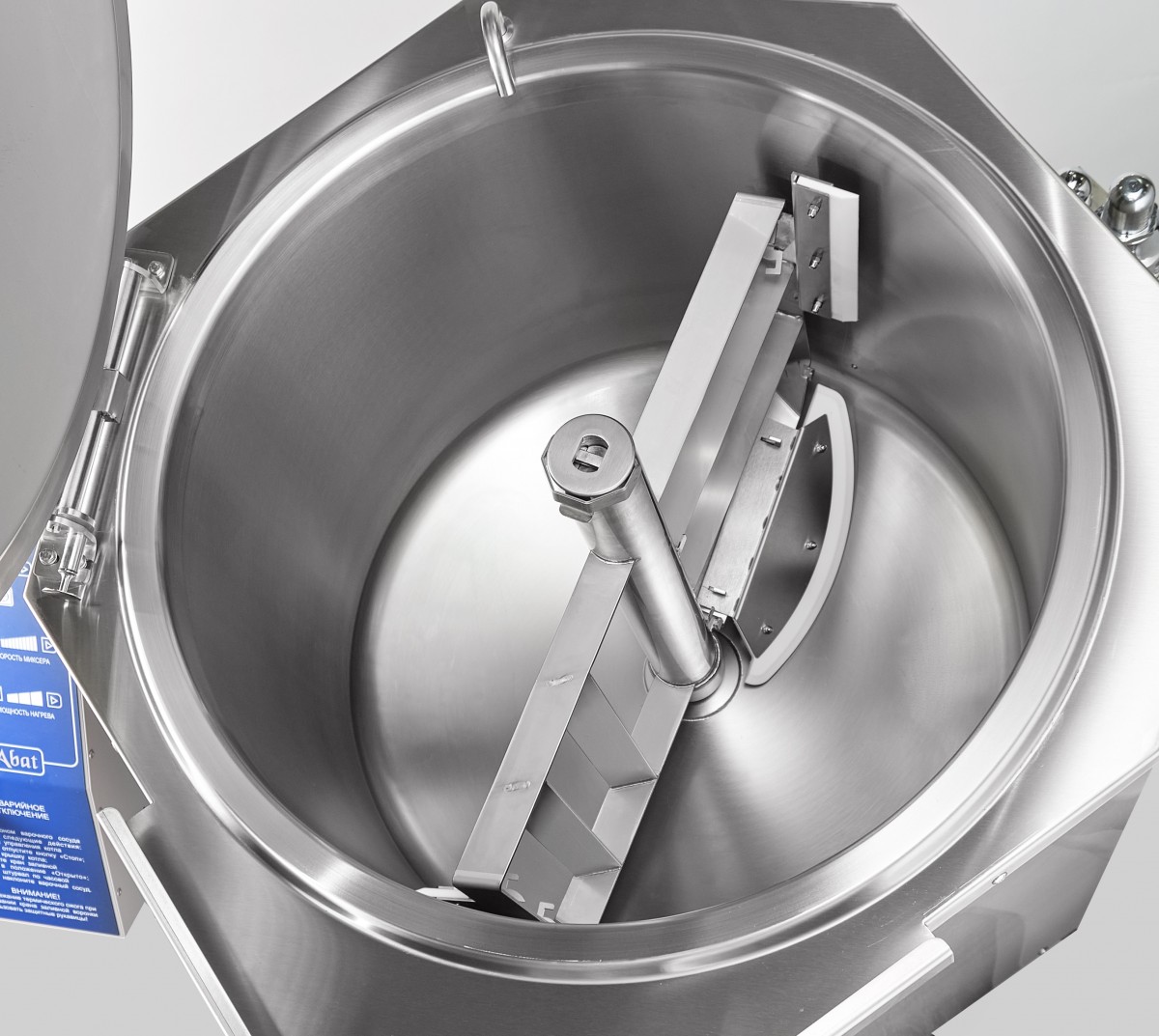 Миксер котла имеет прочную конструкцию с толщиной ребер 3 мм и нижним приводом. Он предлагает плавную регулировку скорости вращения от 0 до 120 об/мин и функцию реверса, что позволяет эффективно перемешивать продукты.