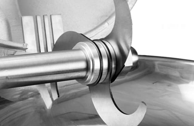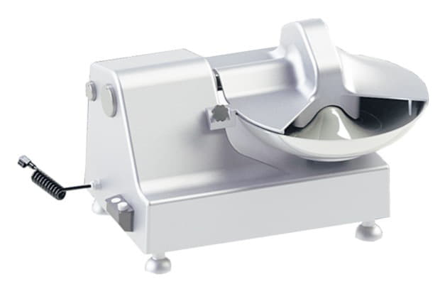 Продукт загружается в чашу из нержавеющей стали, вращающуюся в горизонтальной плоскости перпендикулярно плоскости вращения 3-х лопастного серповидного ножа из нержавеющей стали (Италия).