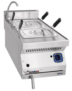 Макароноварка имеет удобные ручки, которые обеспечивают безопасное и быстрое извлечение корзин с готовыми блюдами из кипящей воды. Регулируемые по высоте ножки позволяют адаптировать устройство под любые условия. Слив воды осуществляется через кран, расположенный на передней панели.