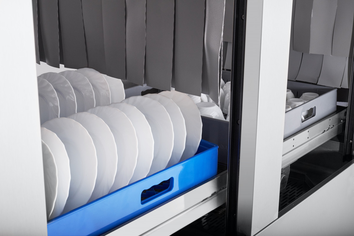 Система сушки гарантирует, что посуда выходит из машины теплой, что сокращает время её окончательного высыхания. Скругленные углы ванны упрощают процесс гигиенической очистки, а разборная конструкция разбрызгивателей позволяет легко их обслуживать. Все металлические элементы, контактирующие с водой, выполнены из нержавеющей стали марки AISI 304, а разбрызгиватели – из AISI 304 и AISI 321.
