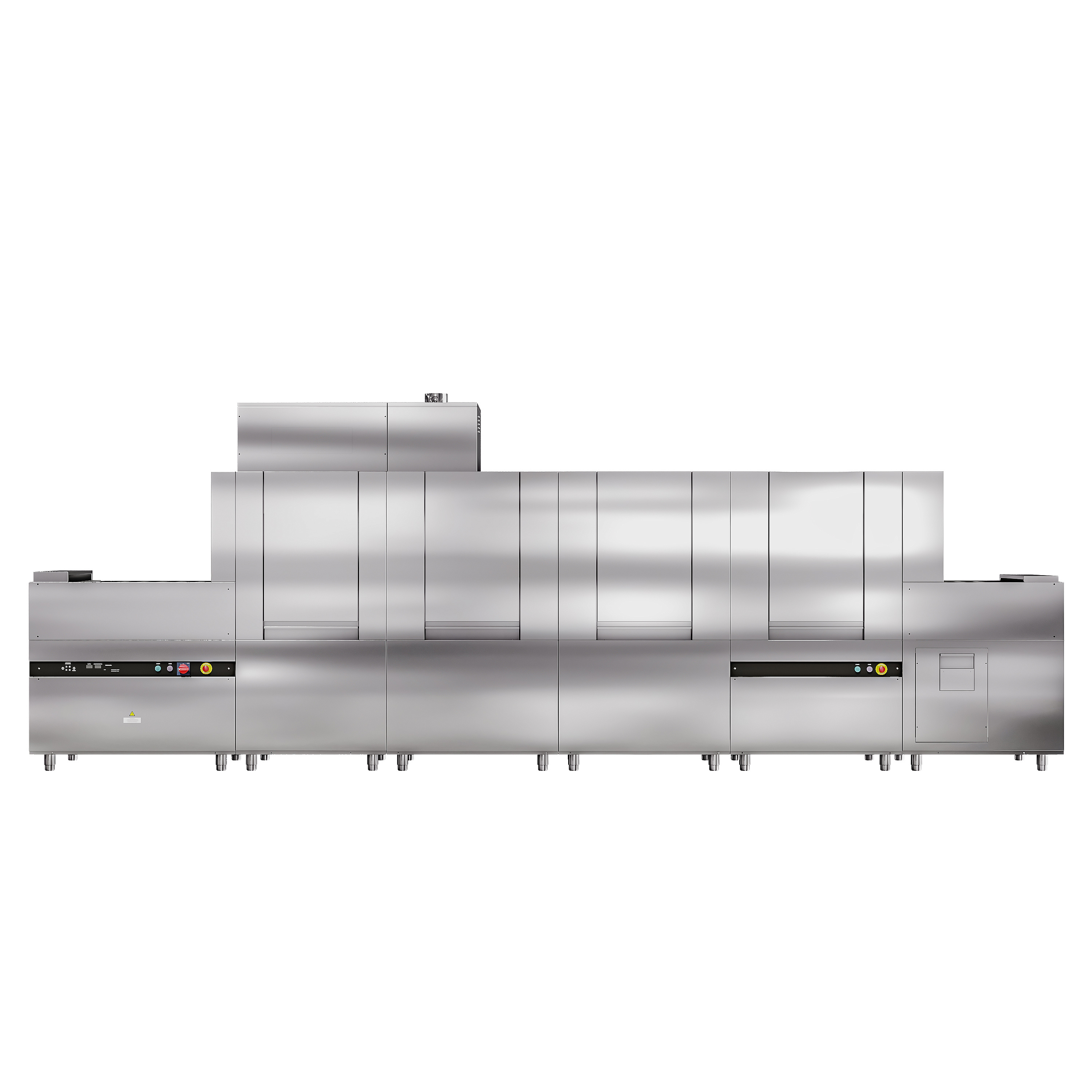 Управление машиной осуществляется с помощью электронной панели, на которой отображаются температура воды в каждой секции и выбранная программа мойки. В зависимости от уровня загрязнения посуды можно выбрать одну из четырех программ, что позволяет адаптировать процесс под конкретные нужды.