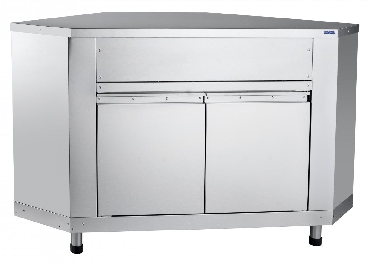 Модуль предназначен для установки в ряды прилавков самообслуживания, выступая в роли промежуточного вспомогательного элемента. В нижней части устройства расположен нейтральный шкаф, который идеально подходит для хранения кухонного инвентаря. Также стоит отметить наличие регулируемых по высоте ножек, что позволяет адаптировать модуль под различные условия эксплуатации.