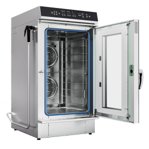 Лоток для сбора конденсата предотвращает попадание капель воды на пол при открытии дверцы, а камера с закругленными углами облегчает уход за оборудованием. Внутренняя подсветка камеры позволяет контролировать процесс приготовления, а степень защиты от влаги соответствует стандарту IPX5, что позволяет мыть устройство изнутри под струей воды.