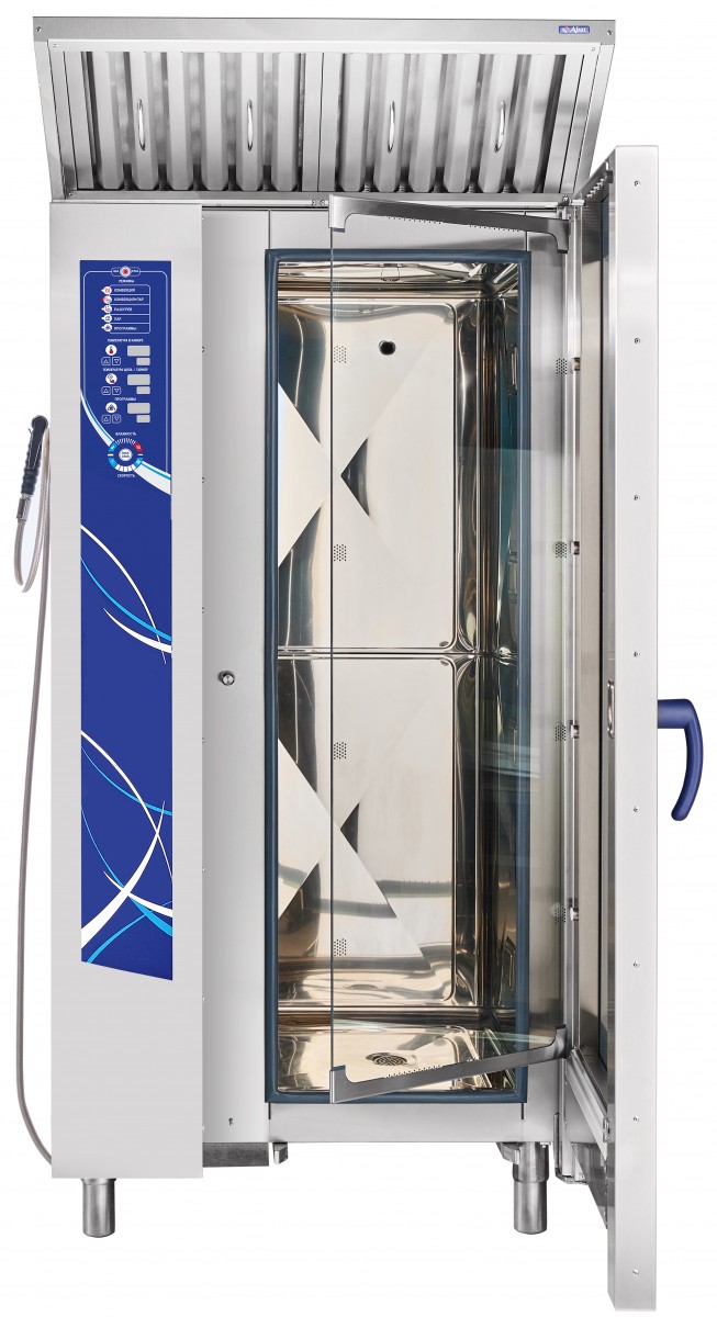 Пароконвектомат оснащен вентилируемой дверцей с двойным термостойким остеклением, что минимизирует риск ожогов. Внутреннее стекло дверцы открывается, что упрощает процесс очистки и предотвращает образование конденсата. Дверь имеет двухходовой механизм открывания для безопасности персонала, а замок работает по принципу "свободные руки", что позволяет закрывать дверцу одним движением.