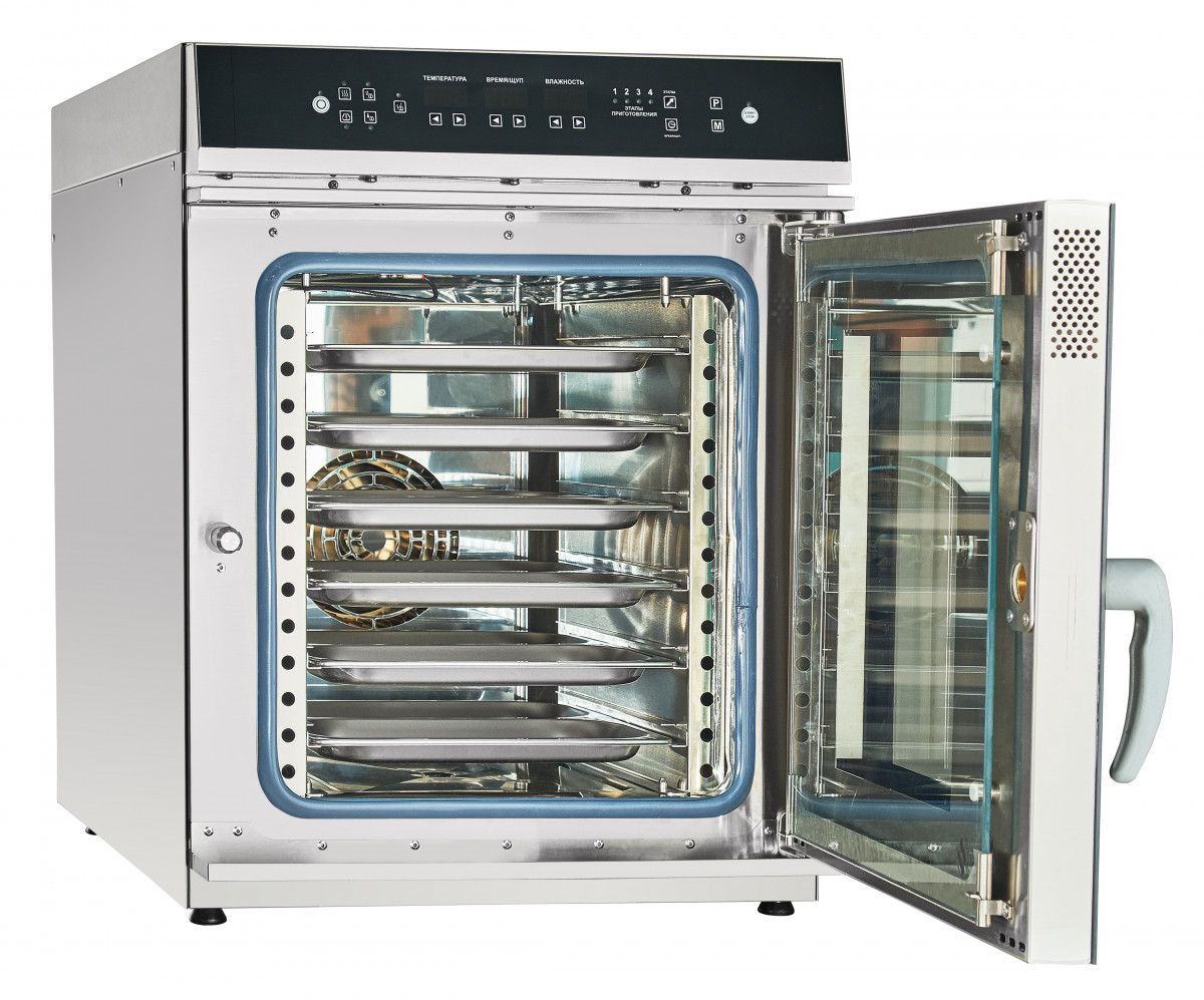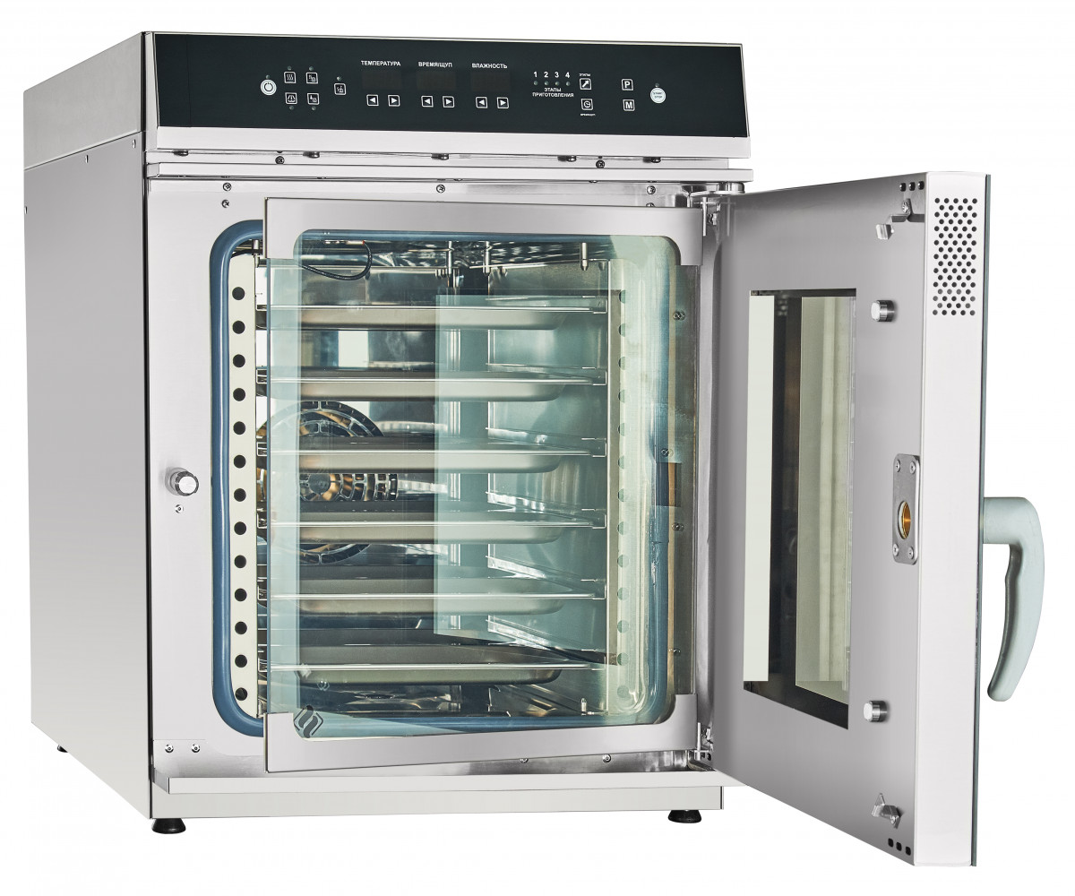 Пароконвектомат также оснащен высокоточным температурным щупом, который можно использовать с базовыми программами для повышения эффективности приготовления. Возможность записи до 110 индивидуальных программ и до 4 этапов приготовления в каждой из них делает его универсальным инструментом для профессиональных поваров.
