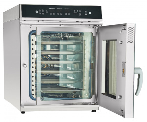 Дополнительные преимущества включают вентилируемую дверцу с двойным термостойким остеклением, что минимизирует риск ожогов, а также систему "свободные руки" для удобного закрытия двери. Лоток для сбора конденсата предотвращает попадание воды на пол при открытии, а закругленные внутренние углы камеры упрощают уход за устройством.