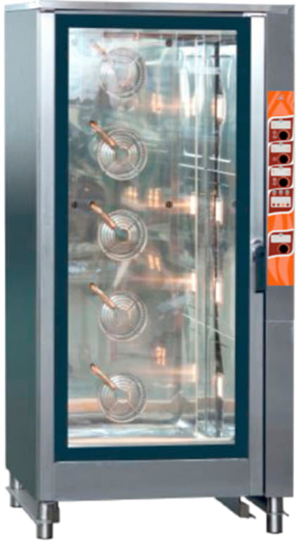 Электромеханическая панель управления Электронный инжекторный впрыск пара Память на 99 программ Термокерн Диапазон регулировки температуры 30-280ºС 3 рабочих режима работы (пар 100 єС, конвекция 30 - 280 єС, комби 100 - 280 єС) Процентная регулировка подачи пара Регулировка скорости вращения вентилятора (6 скоростей) таймер 0-99мин + постоянный режим Закатная тележка на 20 уровней в комплекте , расстояние между уровнями 66мм turbo cold (обдув стекла двери)