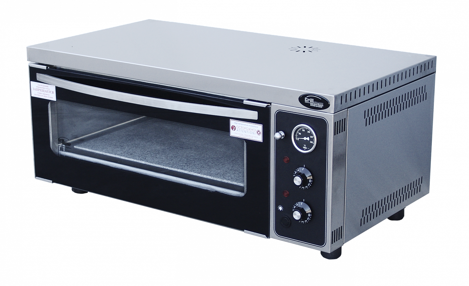 На 2 пиццы 310 мм, 2 терморегулятора 50-400 C,стрелочный термометр 500 С, подсветка в камере, 2-ая стеклянная дверь, шибер, 5 кВт 220В, полностью из н/стали, включая внешние и внутренние панели, под из вулканического камня(+1500С) 30 мм, г.нетто 935х560х420 мм; 50кг; г.брутто:1035х660х670; 75кг