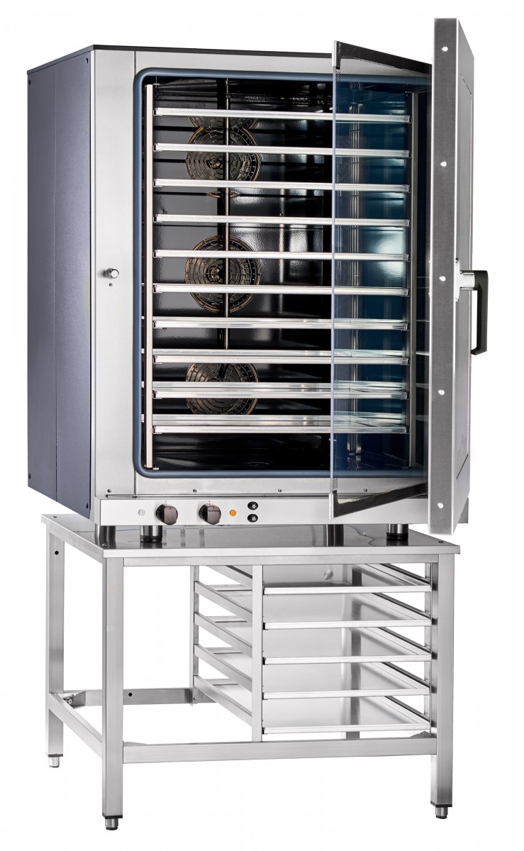 - Три реверсивных вентилятора диаметром 200 мм гарантируют равномерное распределение тепла, что улучшает качество готовки.
