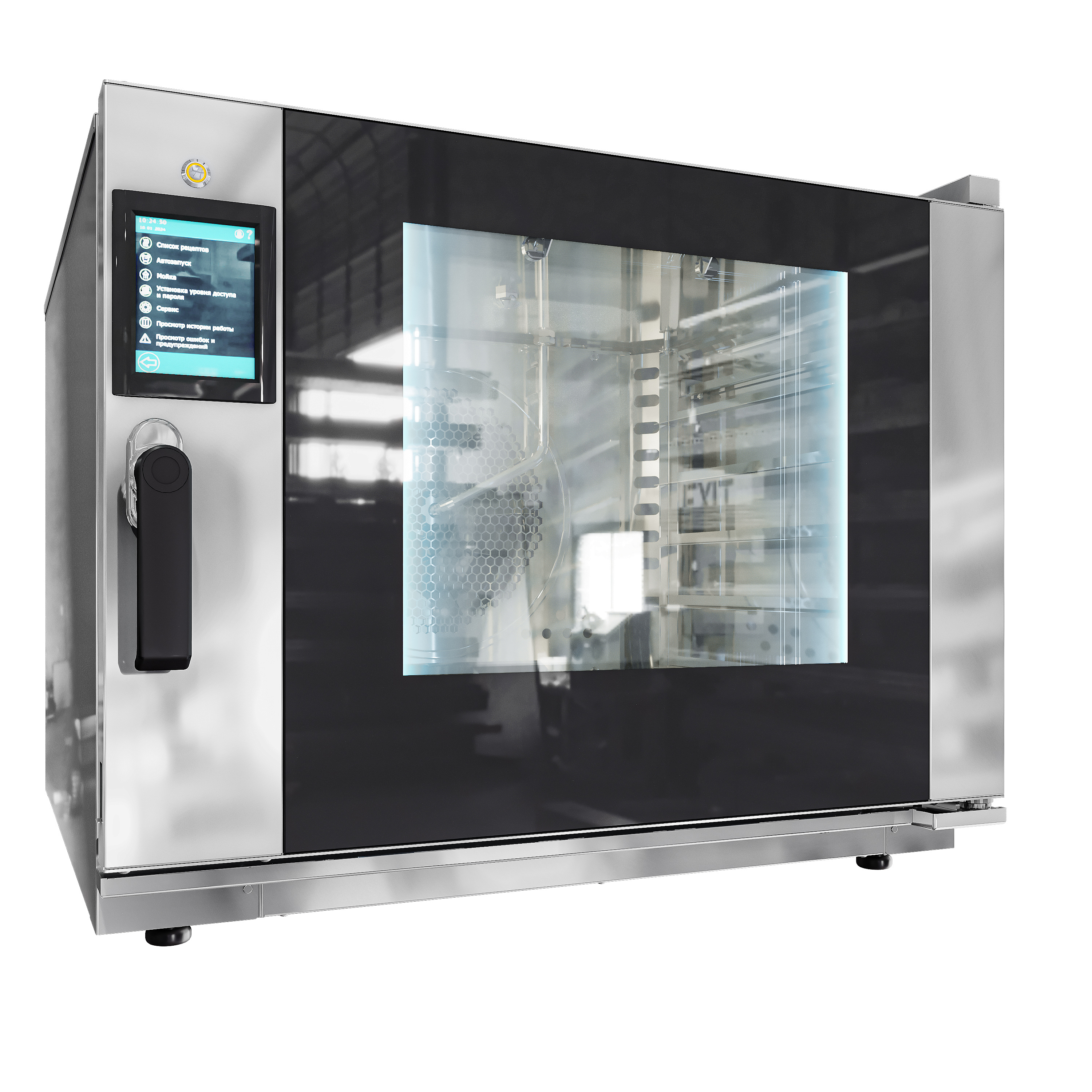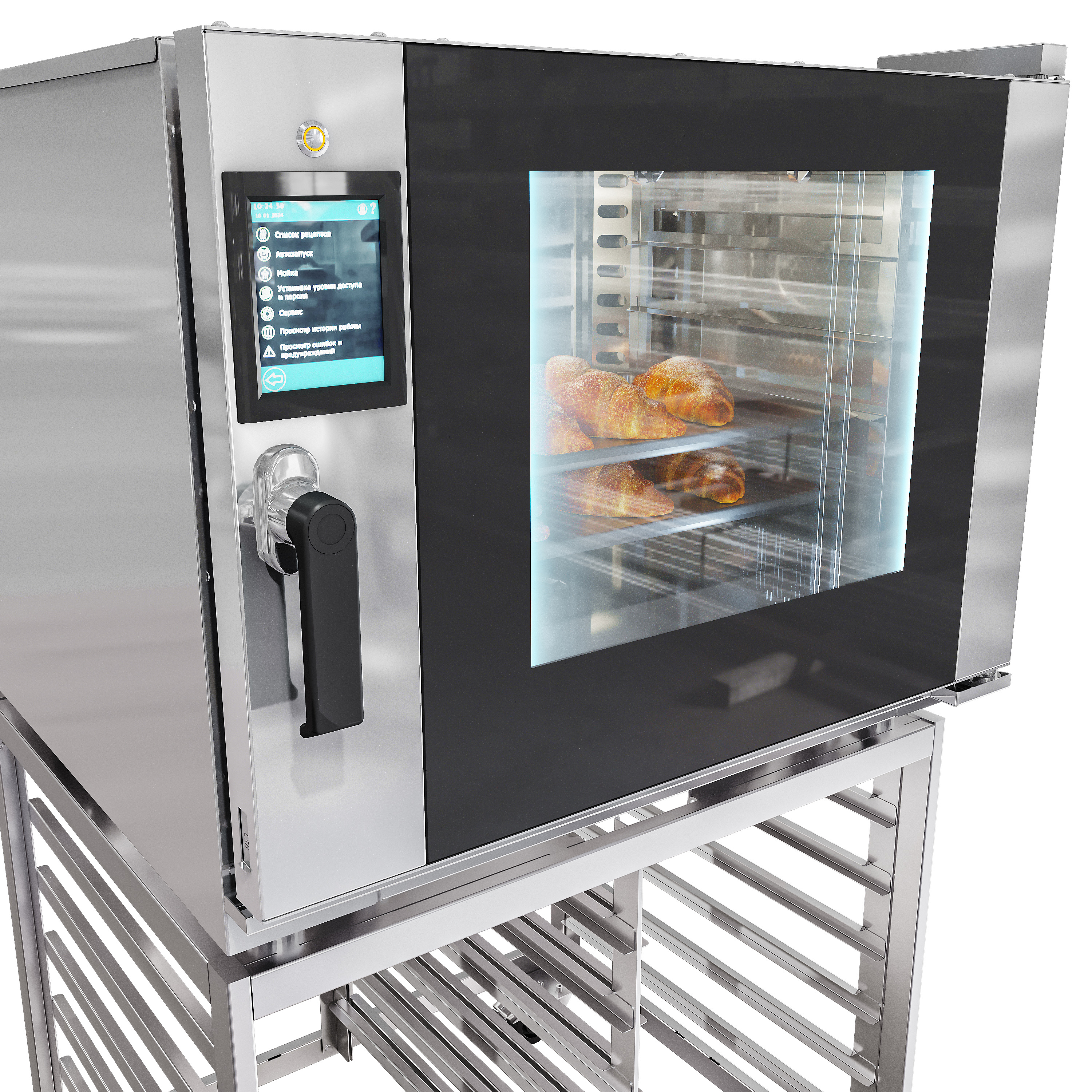 Эта модель оснащена электронной панелью управления (Touch панель), которая расположена на двери устройства, что обеспечивает удобство в эксплуатации. Печь имеет пять уровней для противней размером 600х400 мм, что позволяет одновременно готовить несколько порций.