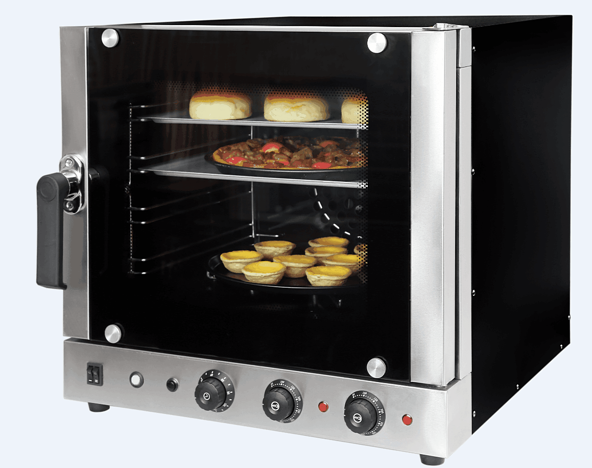 Конвекционная печь, электрическая, с пароувлажнением, независимый верхний и нижний нагрев (50-300оС), таймер 0-60 мин, 3 алюминиевых противня в комплекте, нерж.сталь/окраш.сталь