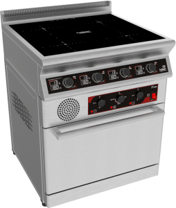 Плита индукционная с духовым шкафом, 4 конфорки мощностью 4х3,5кВт, духовой шкаф - 2 тена (верх/низ) по 2,4кВт, 5 уровней под противни 530х470мм, электронная панель управления плитой с цифровой индикацией, управление духовым шкафом отдельное независимое, 13 уровней нагрева индукции , таймер до 180мин., регулировка температуры духового шкафа механическая (50-270°С), корпус плиты из н.с. AISI 304, духовой шкаф-черный металл, регулируемые по высоте ножки, рабочая поверхность плиты - стеклокерамика 6мм. Протвиня в комплект не входят. 19 кВт, 380В, вес 98 кг.