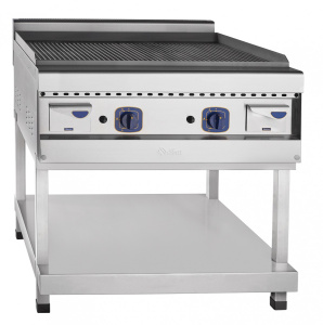 Габариты устройства составляют 840 мм в ширину, 900 мм в глубину и 950 мм в высоту, а вес нетто достигает 112 кг. Жарочная поверхность установлена на устойчивую подставку с полкой, что обеспечивает удобство в использовании. Ножки аппарата регулируются по высоте, что позволяет адаптировать его под любые условия.