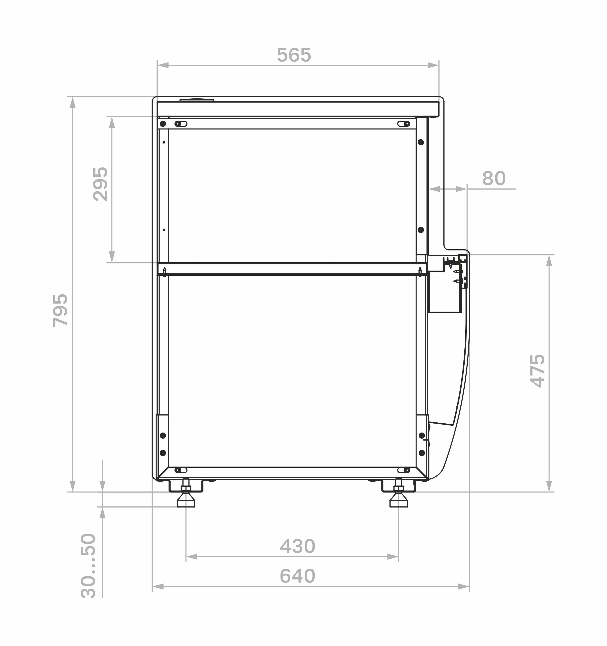 Внутри прилавка расположены три полки с LED-подсветкой, которые обеспечивают привлекательное освещение товаров. Также предусмотрены: