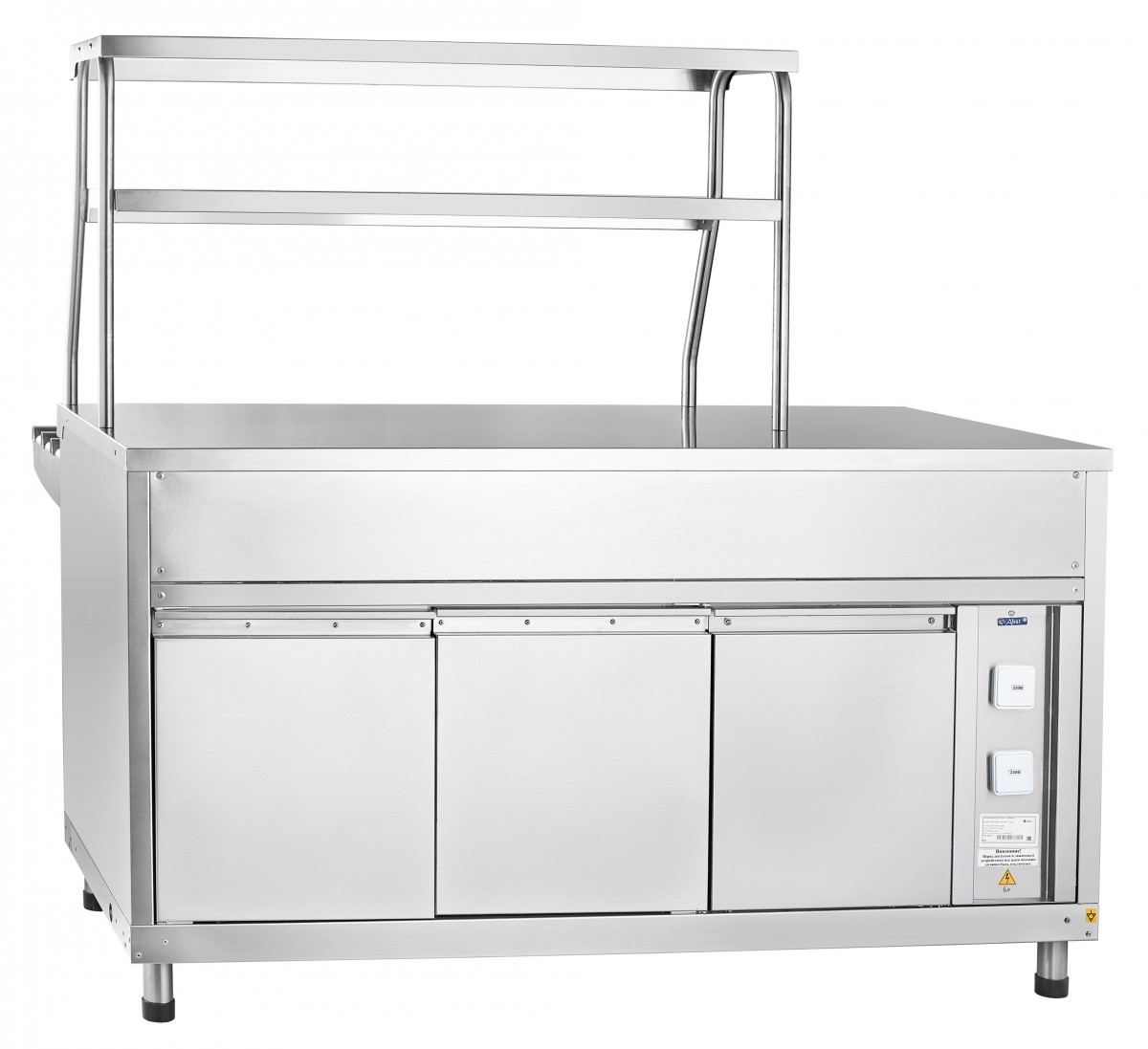 В конструкции предусмотрены направляющие без стыков, что минимизирует риск проливания супов и напитков во время перемещения подносов. В нижней части находится нейтральный шкаф, который идеально подходит для хранения кухонного инвентаря. Регулируемые по высоте ножки позволяют адаптировать прилавок под любые условия эксплуатации.
