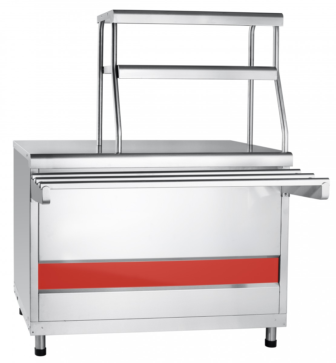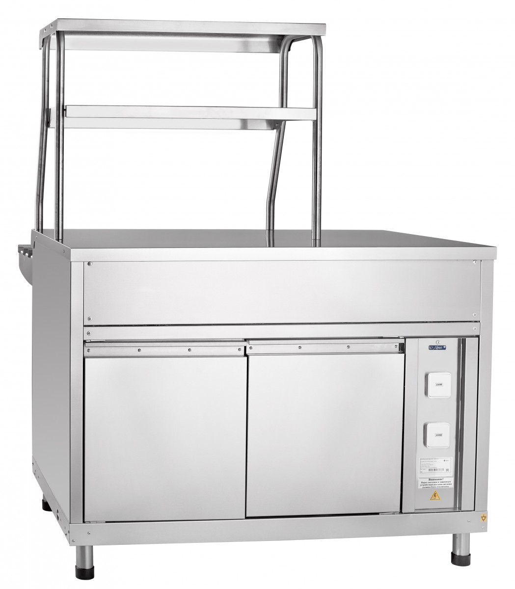 В конструкции предусмотрены направляющие без стыков, что предотвращает проливание супов и напитков во время перемещения подносов. В нижней части находится нейтральный шкаф, который идеально подходит для хранения кухонного инвентаря. Регулируемые по высоте ножки позволяют адаптировать прилавок под любые условия эксплуатации.