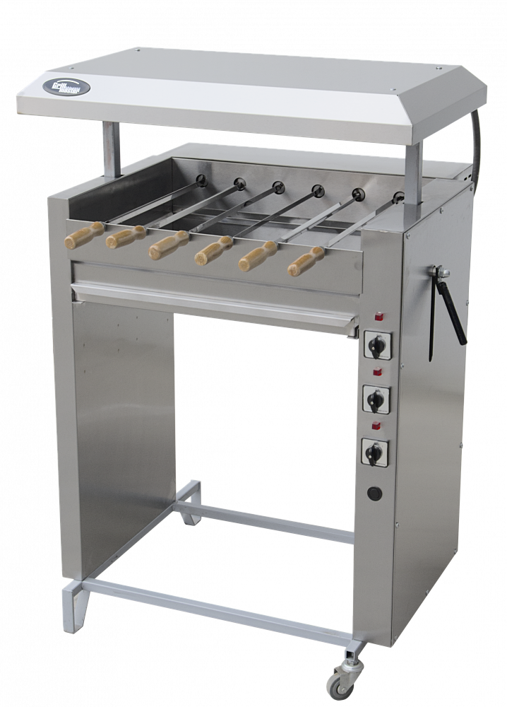 6 шампуров, подъемная крыша, регулирующая уровень тепловой обработки продукта, автоматическое вращение шампуров, колеса со стопорами, полностью из нержавеющей стали, 380В