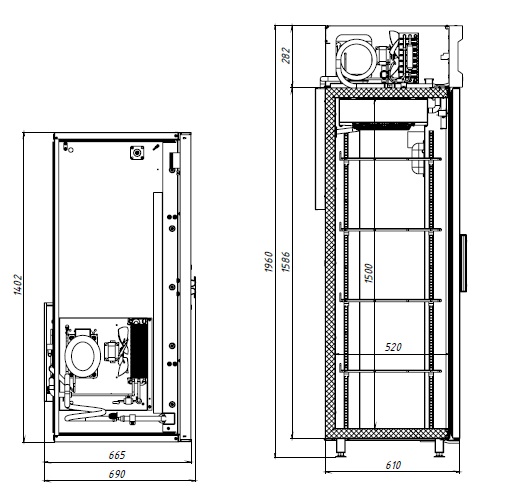 - Габариты: 1402 мм в ширину, 690 мм в глубину и 1960 мм в высоту