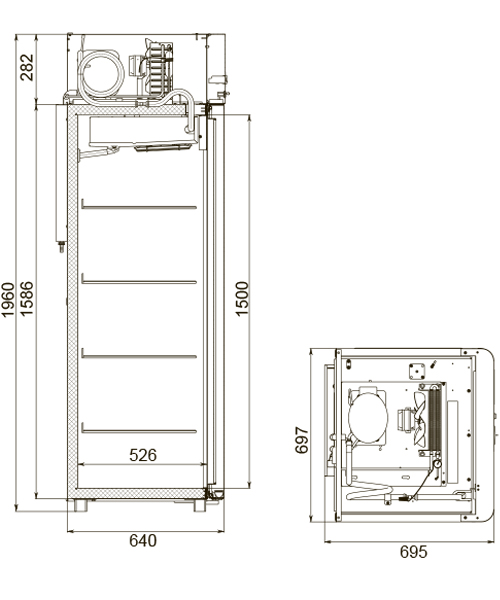 - Размеры: шкаф имеет габариты 697 мм в ширину, 695 мм в глубину и 1960 мм в высоту, а толщина стенок составляет 43 мм, что обеспечивает отличную теплоизоляцию.