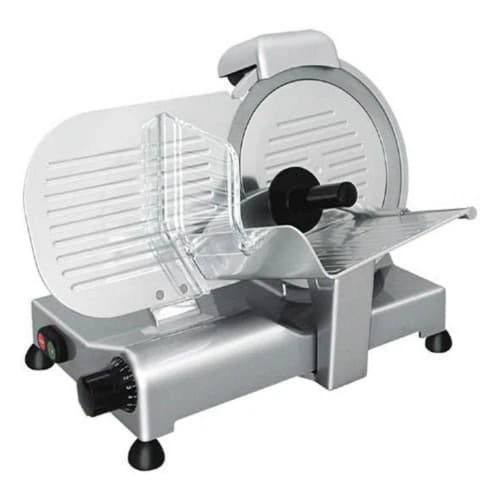 Рез 230x185 мм. Тефлонированный нож. Полуавтоматический слайсер для нарезки мяса, сыра, колбасных изделий и других продуктов питания. Нож из хромированной стали, корпус из лакированного алюминия с пластиковыми деталями. Фиксированное заточное устройство.