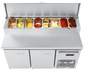 - Столешница имеет ровную поверхность без охлаждения, дополненную бортиком, что предотвращает случайное падение продуктов.