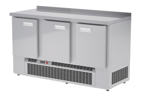 Объем холодильного пространства составляет 370 литров, а агрегат расположен в нижней части устройства, что способствует экономии места и удобству эксплуатации. Стол имеет бортик, что предотвращает случайное падение товаров. Напряжение питания составляет 220 В, а мощность устройства — 0,55 кВт.