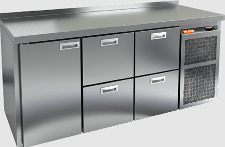 Столешница выполнена из нержавеющей стали, что гарантирует долговечность и легкость в уходе. Толщина столешницы составляет 50 мм, а также предусмотрена 50-миллиметровая теплоизоляция, что способствует эффективному сохранению температуры. Охлаждение осуществляется динамическим способом, а автоматическая оттайка упрощает эксплуатацию.