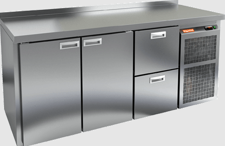 Холодильный агрегат расположен справа, а конструкция стола соответствует гастрономическим стандартам. Устройство имеет бортик, который предотвращает случайное падение продуктов. Работает от сети с напряжением 220 В и мощностью 460 Вт.