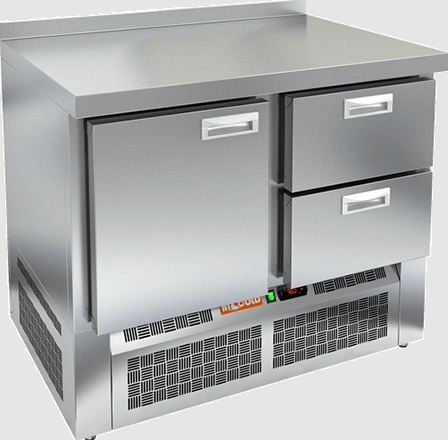 Холодильный агрегат расположен в нижней части конструкции, что способствует эффективному использованию пространства. Столешница выполнена из нержавеющей стали, что обеспечивает долговечность и легкость в уходе. Гастронормированный формат позволяет использовать стандартные контейнеры для удобства хранения.