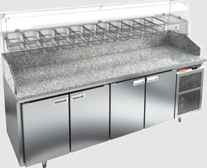 Холодильный агрегат расположен справа, а конструкция соответствует гастронормам, что делает его идеальным для использования с гастрономическими контейнерами. Корпус выполнен из нержавеющей стали, а столешница изготовлена из гранита, что обеспечивает долговечность и легкость в уходе.