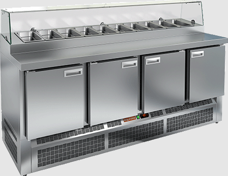 Стол оборудован динамической системой охлаждения и автоматической оттайкой, а электронная панель управления обеспечивает простоту в эксплуатации. Регулируемые по высоте ножки и автоматические доводчики дверей с фиксатором открытого положения добавляют удобства в использовании. Легкозаменяемые магнитные уплотнители гарантируют надежную герметичность.