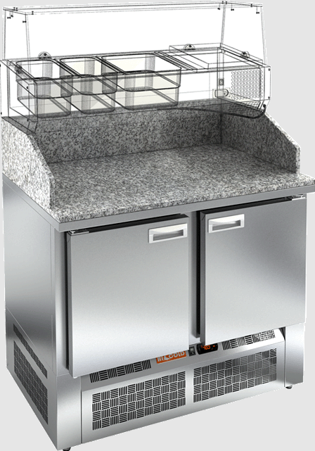 Рабочая поверхность имеет высоту 850 мм и глубину 680 мм, выполнена из прочного гранита, а корпус изготовлен из нержавеющей стали, что обеспечивает долговечность и легкость в уходе. Толщина теплоизоляции составляет 50 мм, что способствует эффективному поддержанию заданной температуры. Охлаждение осуществляется динамическим способом, а оттайка – в автоматическом режиме.