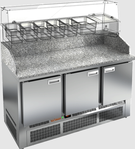 Стол выполнен из нержавеющей стали, а столешница изготовлена из гранита, что обеспечивает долговечность и легкость в уходе. Толщина теплоизоляции составляет 50 мм, а система охлаждения — динамическая, с автоматической оттайкой.