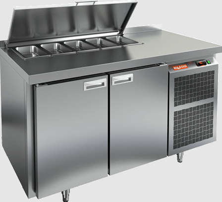 Охлаждение осуществляется динамическим способом, а автоматическая система оттайки упрощает эксплуатацию. Электронная панель управления позволяет легко настраивать необходимые параметры. Стол также включает в себя две полки размером 430х325 мм и может вместить до 5 контейнеров формата GN1/3.