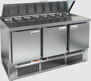 Электронная панель управления позволяет легко настраивать необходимые параметры. Стол рассчитан на размещение восьми гастронормированных контейнеров размером GN1/3, а также включает три полки с размерами 530х325 мм (GN 1/1). Высота борта составляет 50 мм, а ножки можно регулировать по высоте для удобства установки.