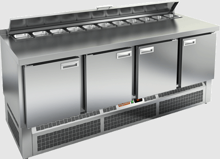 Автоматическая оттайка и электронная панель управления делают эксплуатацию устройства простой и удобной. Стол может вместить 11 контейнеров GN1/6, а размер полки составляет 530х325 мм (GN 1/1). В комплект входят четыре полки, а также предусмотрены: