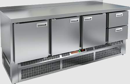 В конструкции предусмотрены три полки размером 430х325 мм, а также регулируемые по высоте ножки, что позволяет адаптировать стол под любые условия. Автоматическая оттайка и электронная панель управления делают эксплуатацию устройства простой и удобной. Высота борта составляет 50 мм, а автоматические доводчики дверей с фиксатором открытого положения обеспечивают дополнительный комфорт при использовании.